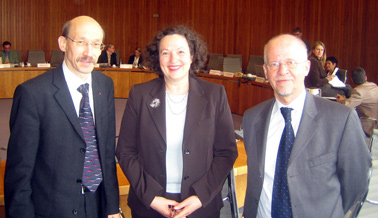 Der Vorsitzende Bovermann zusammen mit der Sprecherin der SPD-Fraktion für die Enquete, Renate Hendricks, und dem Sachverständigen Prof. Dr. Klaus Klemm, Universität Essen-Duisburg.