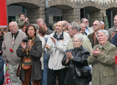 Zur Kundgebung am 1. Mai der IG-Metall in Hattingen waren neben vielen Gewerkschaftlern auch Politiker der SPD anwesend, unter anderem der Landtagsabgeordnete Prof. Dr. Rainer Bovermann und Hattingens Bürgermeisterin Dr. Dagmar Goch. Für die IG-Metall war Otto König, Erster Bevollmächtigter der IG Metall Gevelsberg-Hattingen, Redner in Hattingen.