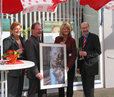 Fototermin vor dem Gebäude Bahnhofstr. 24, SPD-Fraktionsvorsitzender Achim Paas mit einem Druck von Willy Brandt als Präsent der SPD-Fraktion.