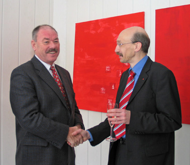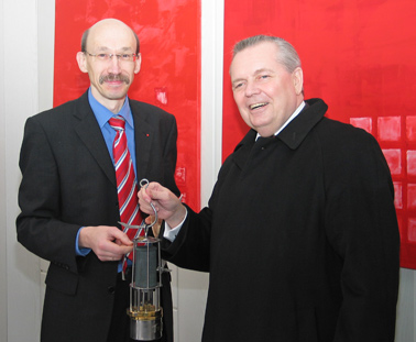 Landtagspräsident a. D. Uli Schmidt überreicht Dr. Rainer Bovermann eine Grubenlampe.