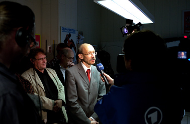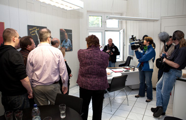 Die Medienvertreter (WDR und WAZ) warten gemeinsam mit den Genossinnen und Genossen auf die ersten Zahlen.