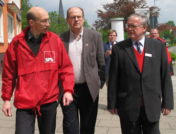 Ludwig Stiegler besuchte am Mittwoch, den 04.05. Hattingen. Empfangen wurde der SPD-Vize auf dem Krämersdorf von Bürgermeisterin Dr. Dagmar Goch, dem SPD-Landtagskandidaten Dr. Rainer Bovermann und von Achim Paas dem Fraktionsvorsitzenden der SPD Ratsfraktion.